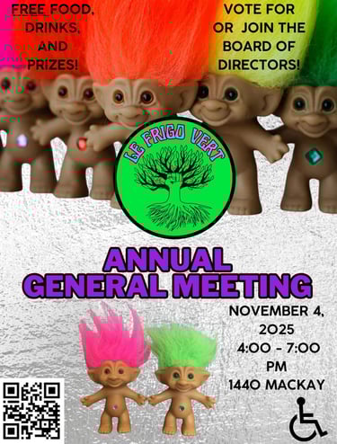 "Great sense of community, an organization that really does great things and its actions continue to match its mandate, We have had the opportunity to write grants, over see in depth financial and general statements with consistent meetings even throughout the pandemic , there is transparency in the organization to a level that is not always present in organizations, get to be involved in the future/visioning, get fed, get to meet new fun people. -Le Frigo Vert Board of Directors Member